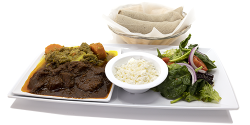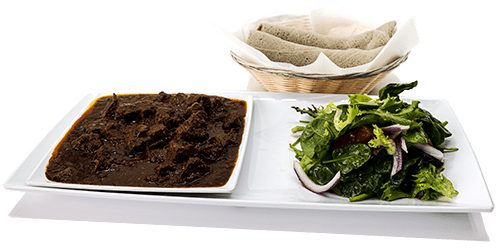 Highly seasoned chickpea powder simmered in canola oil or spiced butter with tender pieces of beef, served with 100% Teff enjera.