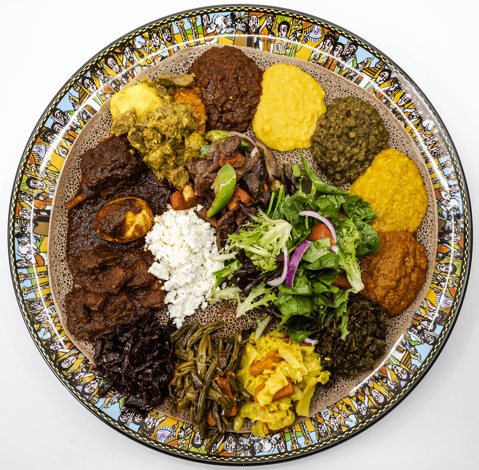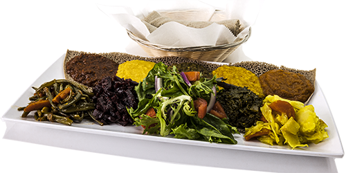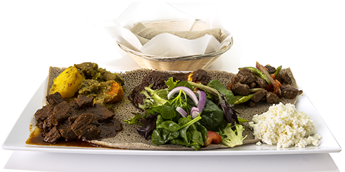 Doro wot, beef tibs and key wot, lamb alecha wot and homemade cottage cheese served with organic spring mix salad and 100% Teff enjera.